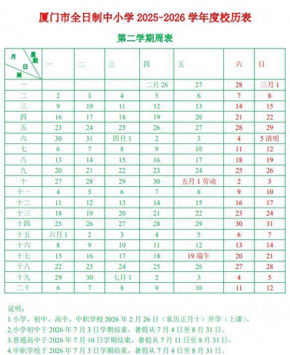 以福建厦门的校历为例,2026年春季学期2月26日正式上课,7月4日左右放暑假,总时长约20周,但减去清明、五一、端午假期,实际教学天数不到90天。