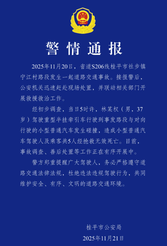 2025年11月20日,省道S206线桂平市社步镇宁江村路段发生一起道路交通事故。接报警后,公安机关迅速赶赴现场处置,并联动相关部门开展救援救治工作。